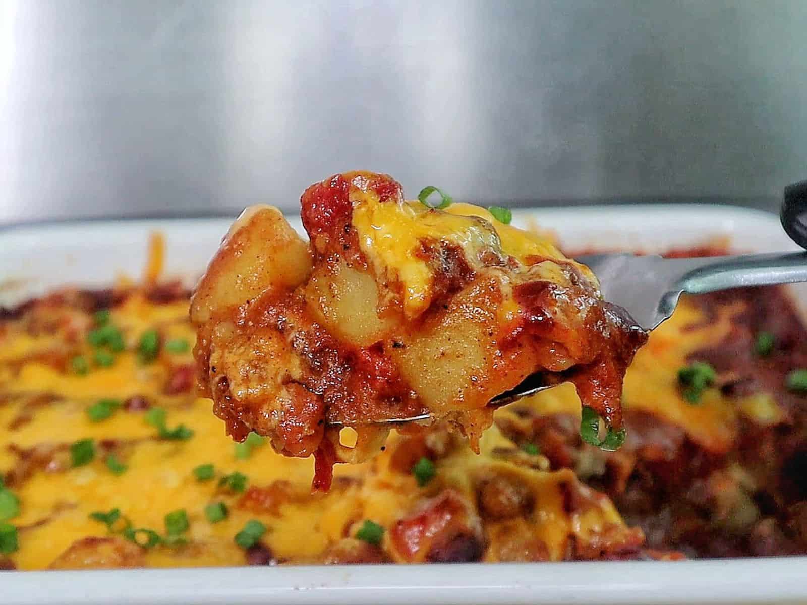 For deeper flavor, season the potatoes right after boiling with a pinch of salt and pepper before mixing them with the chili mixture. This helps the potatoes stay flavorful throughout the bake.